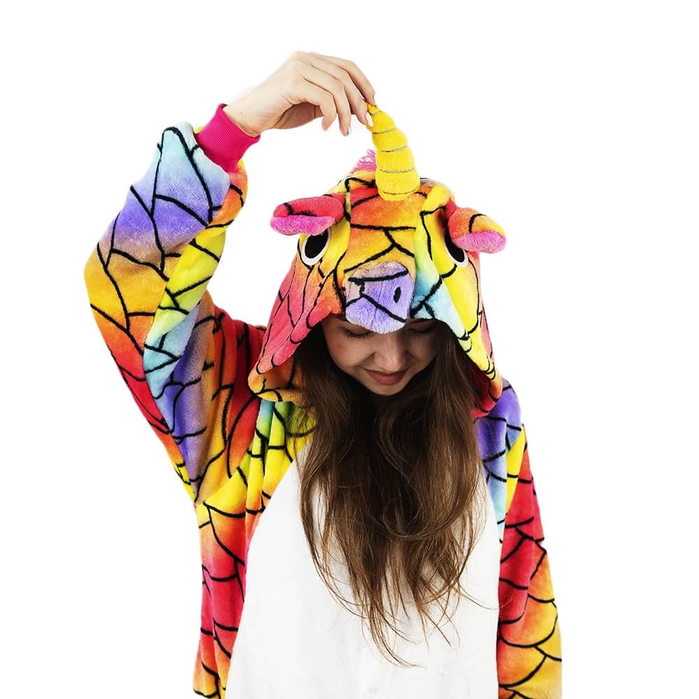 Кигуруми Единорог Хамелеон отличается ярким дизайном и красочной расцветкой. Он сшит из мягкой, с небольшим ворсом ткани, которая практически не мнется. Принт имитирует чешую. Креативное оформление подчеркивается объемным декором: хвостиком сзади, большим рогом и ушками на капюшоне, пушистой розовой гривой. На животе есть белая вставка.